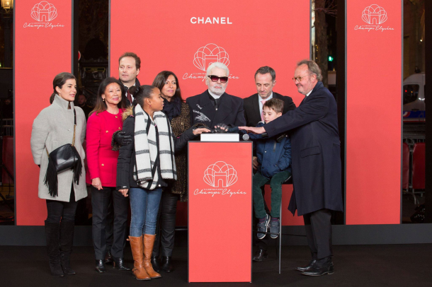 Karl Lagerfeld a urcat pe scenă alături de primarul Parisului și, în fața unei mulțimi adunate pe bulevard, a aprins miile de luminițe roșii care împodobesc copacii de pe marginea străzii.