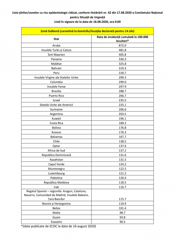 La începutul acestei săptămâni, Comitetul Național pentru Situații de Urgență a publicat lista actualizată statelor considerate a fi cu risc epidemiologic ridicat și pentru care se instituie măsura carantinării în cazul persoanelor care sosesc în România din aceste destinații. Printre statele vizate sunt Peru, Columbia, Brazilia, Israel, Argentina, Kosovo, Muntenegru, Luxemburg, Republica Moldova, Bosnia și Herțegovina sau Malta.