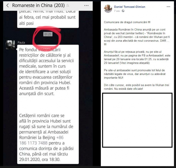 Tot miercuri, în aceeași zi în care MAE a făcut acest anunț, Daniel Tomozei-Dimian, care locuiește în Beijing, a publicat pe Facebook un mesaj privat primit se pare de la Ambasada României în China, prin care românii de acolo erau informați asupra unei posibile operațiuni de evacuare. Nu e foarte clar în acest moment de ce anunțul nu a fost asumat public de Ambasadă.