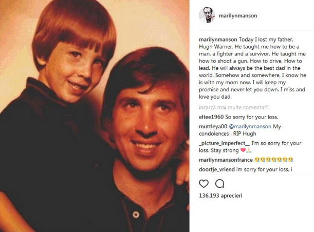 "Astăzi mi-am pierdut tatăl, Hugh Warner. El m-a învățat cum să fiu bărbat, luptător și un supraviețuitor. M-a învățat să trag cu arma și cum să conduc. El va fi întotdeauna cel mai bun tată din lume. Undeva, știu că este acum cu mama. O să-mi țin promisiunea și nu mă voi lăsa. Tată, mi-e dor de tine și te iubesc, ascris Marilyn Manson.