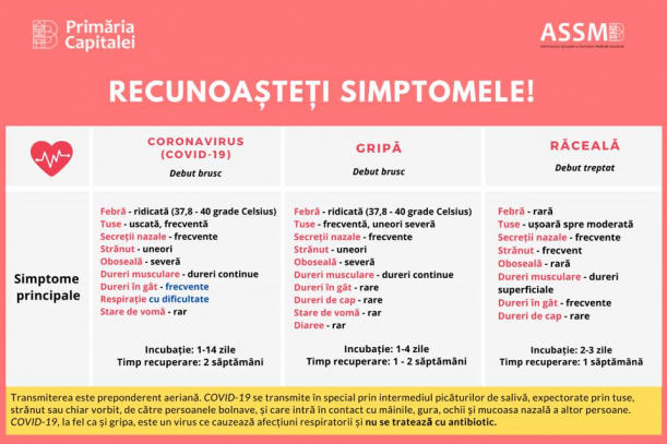 Administrația Spitalelor și Serviciilor Medicale București (ASSMB) a transmis un grafic despre cum se pot deosebi simptomele coronavirusului de cele ale unei simple răceli, sau de cele ale gripei.