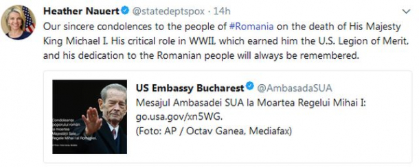 "Sincere condoleanţe poporului român pentru moartea Majestăţii Sale Regele Mihai I. Rolul său decisiv în al Doilea Război Mondial, care i-a adus medalia "U.S. Legion of Merit", şi dedicarea sa pentru poporul român vor fi întotdeauna ţinute minte./ Our sincere condolences to the people of #Romania on the death of His Majesty King Michael I. His critical role in WWII, which earned him the U.S. Legion of Merit, and his dedication to the Romanian people will always be remembered", scrie Nauert pe Twitter.