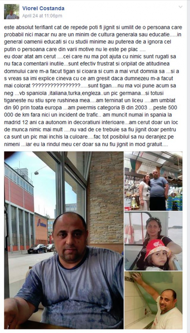 „Este absolut terifiant cât de repede poţi fi jignit şi umilit de o persoană care probabil nici macar nu are un minim de cultură generala sau educaţie… În general, oamenii educaţi şi cu studii minime au puterea de a ignora, cel puţin, o persoană care, din varii motive, nu le este pe plac. Sunt efectiv frustrat şi oripilat de atitudinea domnului care m-a făcut ţigan şi cioară şi cum a mai vrut domnia sa… Şi aş vrea să-mi explice cineva cu ce am greşit dacă Dumnezeu m-a făcut mai colorat ???????????????? Sunt ţigan… nu mă voi pune acum să neg. Vb spaniola, italiana, turka, engleza, un pic germană, şi totuşi ţigăneşte nu ştiu, spre rushinea mea… Am terminat un liceu, am umblat din ’90 prin toată Europa, am permis categoria B din 2003, peste 500.000 de km fără nici un incident de trafic… Am muncit numai în Spania, la Madrid, 12 ani ca autonom în decoraţiuni interioare. Am cerut doar un loc de muncă, nimic mai mult. Nu văd de ce trebuie să fiu jignit doar pentru că sunt un pic mai închis la culoare. Fac tot posibilul să nu deranjez pe nimeni, iar eu, la rândul meu, cer doar să nu fiu jignit în mod gratuit”, a scris Viorel Costanda pe grupul de pe Facebook.