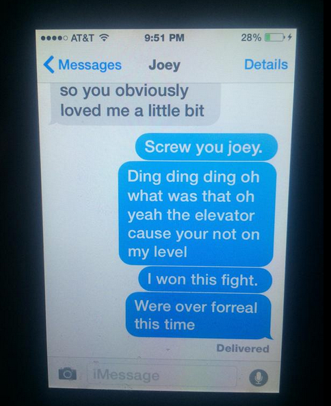 „Ding ding ding ce a fost asta? Sunetul liftului, pentru că nu mai eşti la nivelul meu. Eu am câştigat cearta asta. Acum chiar s-a terminat totul între noi”, i-a scris adolescenta prietenului.
