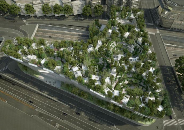 Proiectul poartă numele de “Satul plutitor în mijlocul pădurii” și va fi ridicat în câțiva ani în locul unei parcări de la marginea Parisului. Produsul final va fi o clădire cu spațiu verde, pe acoperișul căreia vor fi locuințe și 1000 de copaci. Conform proiectului, construcția, care se va întinde peste șoseaua de centură a capitalei Franței, va servi și drept pod pietonal.