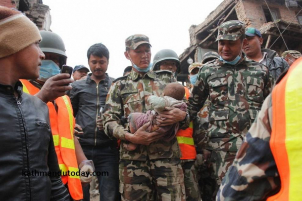 Bebeluşul era îngropat sub zeci de tone de moloz. Iniţial, echipele de salvare nu au reuşit să-l scoată pe micuţ, însă, câteva ore mai târziu, plânsetul acestuia i-a făcut pe soldaţii nepalezi să mute o întreagă clădire pentru a-l scoate pe copil. Ca un miracol, bebelușul nu a suferit niciun fel de răni interne, dar doctorii au constatat că era deshidratat. Jurnalistii de la Kathmandu Today au făcut publice imagini cu un bebelușul scos de sub dărâmături.
