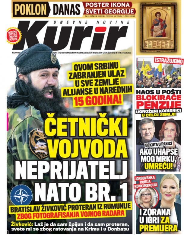 „Comandantul mișcării Chetnik, Hadzi Bratislav Zivkovic, nu poate intra în statul vecin, deoarece a fotografiat radare militare pe coasta Mării Negre și a subminat securitatea națională.” „Tot în prezent cea mai mare amenințare la adresa NATO!” titrează ziarulkurir.rs