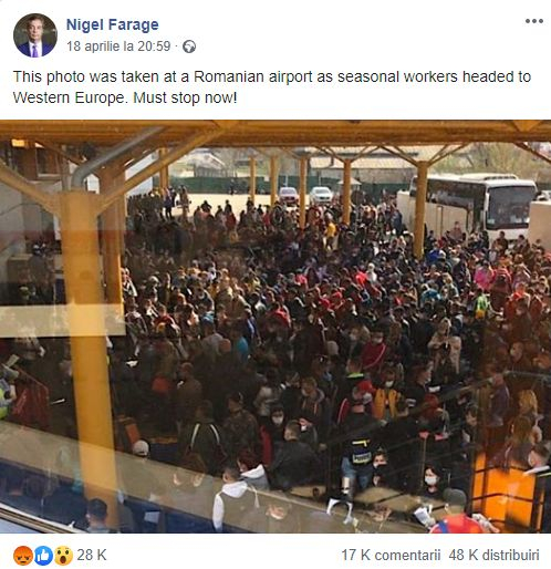 „Fotografia asta a fost făcută pe un aeroport din România, în timp ce muncitorii sezonieri se îndreaptă spre Vestul Europei. Asta trebuie să înceteze acum!”, a tunat Farage.
