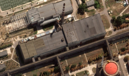 Noi imagini din satelit obținute de compania Maxar Technologies dezvăluie prezența a cel puțin trei găuri în acoperișul unei clădiri situate în apropierea locului unde se află cel puțin trei transportoare blindate de trupe, în perimetrul centralei nucleare Zaporojie.