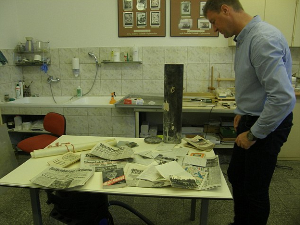 Cercetătorii au găsit în capsulă, un cilindru de culoare neagră, mai multe fotografii, ziare și documente din perioada în care Germania era condusă de naziști, precum și două copii ale lucrării Mein Kampf, în care Hitler a descris ideologia și convingerile sale rasiste. De asemenea, în capsulă a mai fost descoperită și o scrisoare adresată celor ce aveau să o descopere în viitor, notează ynetnews.com.