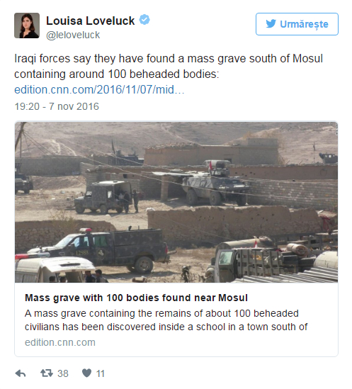 Nu a fost precizat dacă această tragedie s-a produs de curând, însă Organizaţia Naţiunilor Unite anunţase de ceva vreme că gruparea teroristă a executat zeci de persoane în preajma oraşului Mosul, potrivit CNN.