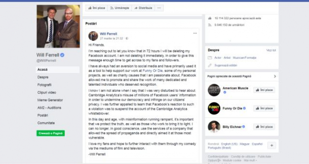 Actorul Will Ferrell a anunţat că va renunţa până vineri la contul său de Facebook din cauza scandalului Cambridge Analytica.