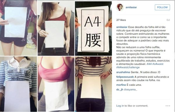 Fotografiile prezintă femeile foarte slabe care își acoperă talia cu o coală A4 verticală, fără să li se vadă deloc părțile latarale.