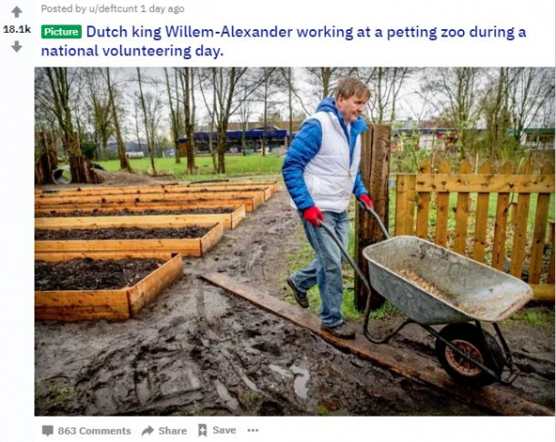 Imaginile în care apare regele în haine de muncă, ducând o roabă, au devenit virale în mediul online.