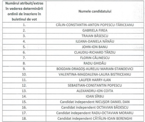 Biroul electoral de circumscripţie din București a anunțat ordinea pe buletinul de vot a candidaților la Primăria Capitalei și a partidelor la Consiliul General al Municipiului Bucureşti. Pentru Primărie, primul pe buletinul de vot este Călin Popescu Tăriceanu (ALDE), urmat de Gabriela Firea (PSD) și Traian Băsescu (PMP). Considerat principalul rival al Gabrielei Firea, Nicușor Dan, candidat independent susținut de PNL și USR-PLUS, se află abia pe poziția 15. Pe lista de candidați se mai regăsesc Florin Călinescu, Bogdan Stanoevici, Laura Bistriceanu, Ilan Laufer, Alexandru Coita, Radu Moraru și Cătălin Berenghi. În total, sunt 18 candidați. Cât despre Consiliul General al Municipiului Bucureşti, ALDE, PSD și PMP sunt primele pe buletinele de vot. PNL e pe poziția a patra, iar UDMR pe a cincea. Alianţa USR-PLUS e abia pe 11. Ordinea a fost stabilită prin tragere la sorți.