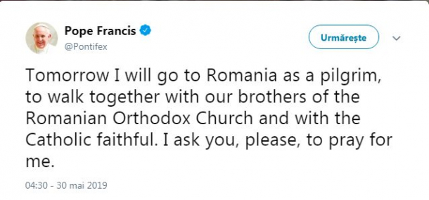 „Mâine vă voi duce în România ca un pelerin, pentru a merge împreună cu fraţii noştrii din Biserica Ortodoxă Română şi cu credincioşii catolici. Vă rog să vă rugaţi pentru mine”, a scris Papa Francisc pe Twitter.