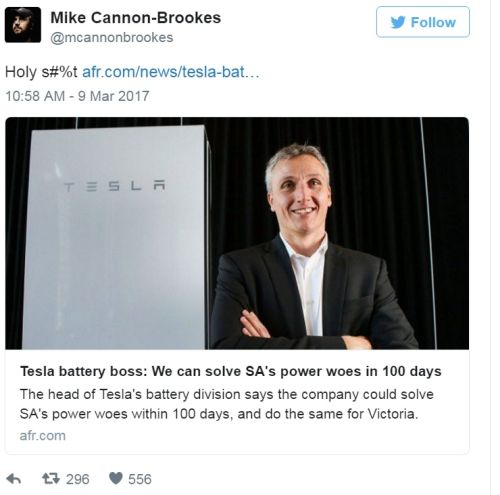 În replică, într-un mesaj peTwitter, miliardarul australian Mike Cannon-Brookes l-a întrebat pe Musk dacă vrea să facă un pariu pe acest subiect. Musk a răspuns: "Tesla va instala sistemul care va deveni funcțional în 100 de zile de la data semnării contractului, în caz contrar totul va fi gratuit".