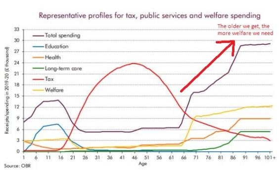 În plus, persoanele mai în vârstă primesc mai mult ajutor de la stat decât contribuția lor. În grafic se poate observa cât plătesc oamenii în diverse etape ale vieții pentru a-și asigura bunăstarea.