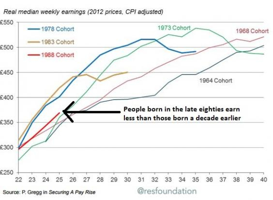 Tinerii câștigă acum cu 50 de lire sterline mai puțin decât acum 10 ani.