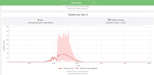 În ceea ce privește România, măsurătorile realizate de cătreIHME prezic vârful pandemiei, pe data de 13 aprilie. În această zi, conform graficelor, se vor înregistra până la 39 de decese cauzate de infecția cu noulcoronavirus.