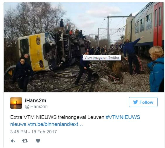 „Trenul a deraiat şi s-a răsturnat pe o parte la ieşirea din gara Louvain”, a anunţat metro.co.uk.