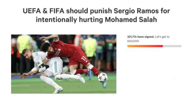 Oamenii cer suspendarea fundașului de la Real Madrid pentru accidentarea provocată atacantuluiMohamed Salah, Liverpool, informeazăchange.org.