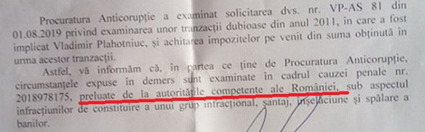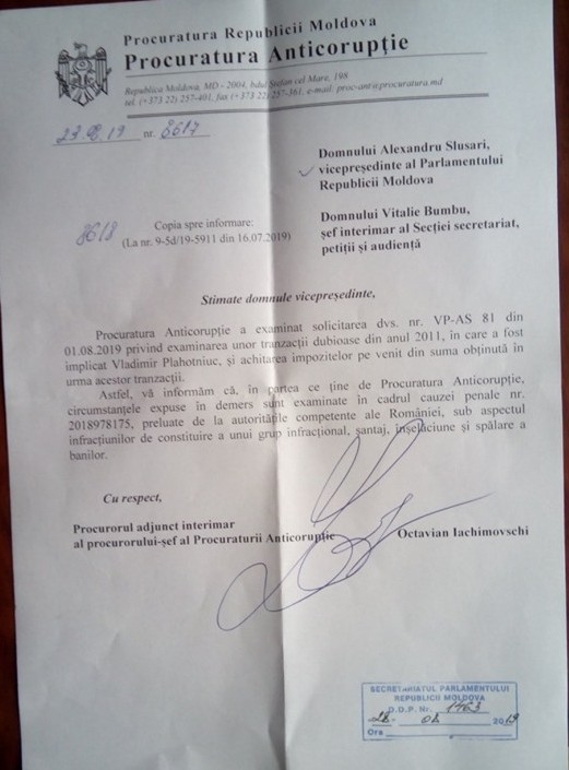 Documentul a fost obţinut de cătrevicepreședintele Parlamentului, Alexandru Slusari, în urma unei solicitări făcute către Procuratura Anticorupţie din Republica Moldova.