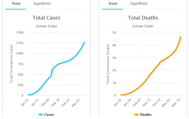 Foto: Evoluţia infectărilor (stânga) şi a deceselor (dreapta), în intervalul 22 ianuarie – prezent (sursă foto: worldometers.info)