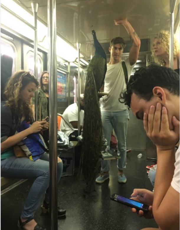 Un tânăr a devenit vedetă pe Internet după ce a fost fotografiat în metroul din New York având un păun imens.