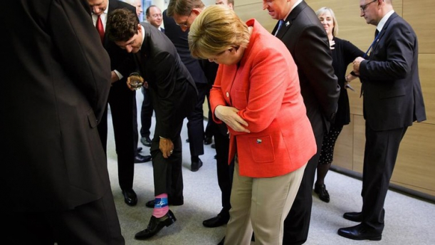 Justin Trudeau și-a prezentat șosetele în fața Angelei Merkel, aceasta arătându-se încântată de vestimentația non-conformistă a acestuia.