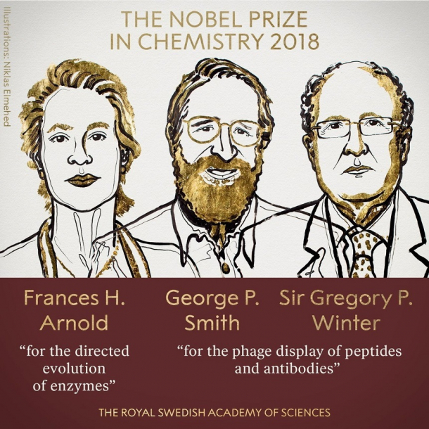 Cercetătorii Frances H. Arnold (SUA), George P. Smith (SUA) și Gregory P. Winter (Marea Britanie) au primit Premiul Nobel pentru Chimie pe 2018, după cum a anunţat miercuri Academia Regală de Ştiinţe din Suedia.