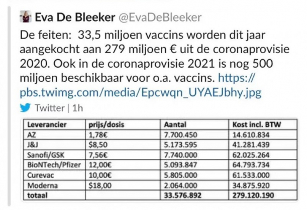 Eva De Bleeker, secretarul belgian de stat pentru Buget și Protecția Consumatorilor, a publicat din greșeală, pe Twitter, prețurile negociate de UE pentru vaccinurile anti-COVID-19 și suma pe care o va da Belgia pentru ele. A șters mesajul la scurt timp, dar tot a fost prea târziu. Potrivit tabelului, cel mai ieftin vaccin negociat de Uniunea Europeană e cel de la Oxford – AstraZeneca – sub 2 euro, iar cel mai scump e cel de la Moderna – 18 dolari.