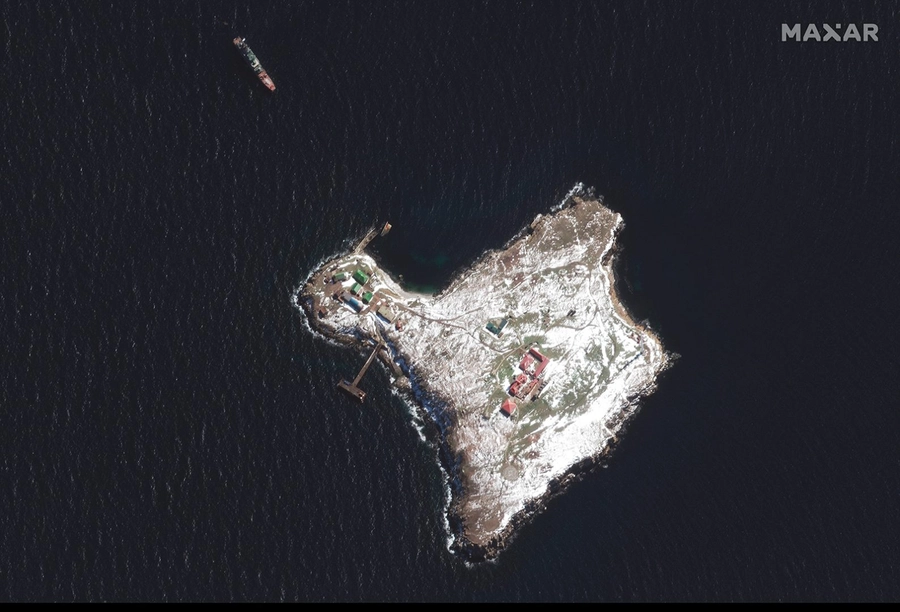În imagine se pot observa pagubele pe care le-au produs bombardamentele la câteva dintre clădirile cu acoperiș roșu din mijlocul insulei. Vasul ancorat în largul insulei a fost identificat de Maxar drept o navă de clasă Ropucha. Deși anumite zone ale insulei sunt acoperite de zăpadă, se pot observa craterele provocate de loviturile rusești.