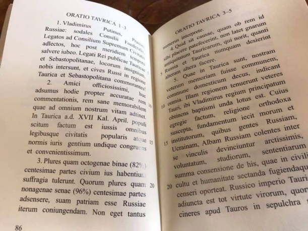 Max Seddon, corespondentul Financial Times la Moscova, a publicat pe pagina sa de Twitter imagini cu o nouă apariție editorială de la Moscova care conține, nici mai mult, nici mai puțin decât Discursurile politice ale lui Vladimir Putin, traduse în … limba latină.