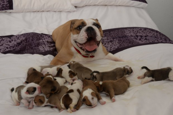 Performanță uluitoare a unei cățelușe din rasa Bulldog. Patrupedul în vârstă de trei ani a dat naștere la 14 pui deodată.