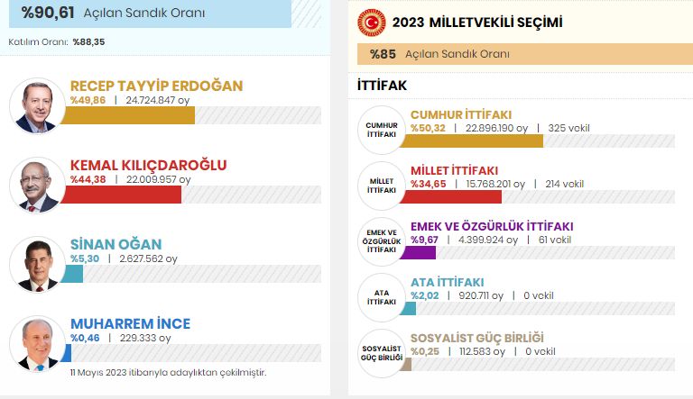 Rezultatele timpurii l-au adus pe Erdogan confortabil în avantaj, dar pe măsură ce numărătoarea a continuat, avantajul său s-a erodat, și par să ducă spre un nou tur pe 28 mai. În prezent, chiar media de stat turcă indică după numărarea a 82% din secțiile de votare, că avantajul lui Erdogan a scăzut considerabil, la 50,3%, în timp ce contracandidatul său ar fi obținut 43,9%, potrivit haberturk.