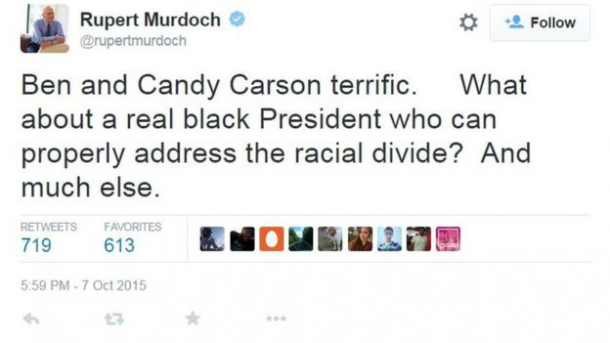 În mesajul postat pe Twitter, fondatorul imperiului media News Corp, îl lăuda pe candidatul republican la președinție, Ben Carson, dar și pe soția acestuia, Candy Carson.
