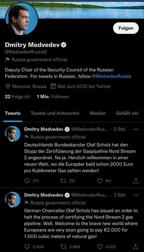 Fostul președinte al Federației Ruse Dmitri Medvedev îi avertizează pe europeni cu privire la creșterea prețurilor la gaz. Evident că din cauza opririi conductei germano-ruse de la Marea Baltică, celebra Nord Stream 2 unde și OMV-ul austriac e parte. Și e doar începutul sancțiunilor…