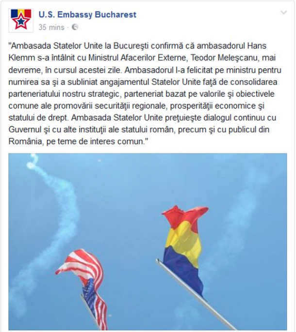 "Ambasada Statelor Unite la Bucureşti confirmă că ambasadorul Hans Klemm s-a întâlnit cu Ministrul Afacerilor Externe, Teodor Meleşcanu, mai devreme, în cursul acestei zile. Ambasadorul l-a felicitat pe ministru pentru numirea sa şi a subliniat angajamentul Statelor Unite faţă de consolidarea parteneriatului nostru strategic, parteneriat bazat pe valorile şi obiectivele comune ale promovării securităţii regionale, prosperităţii economice şi statului de drept. Ambasada Statelor Unite preţuieşte dialogul continuu cu Guvernul şi cu alte instituţii ale statului român, precum şi cu publicul din România, pe teme de interes comun", a scris instituția pe contul oficial de Facebook.