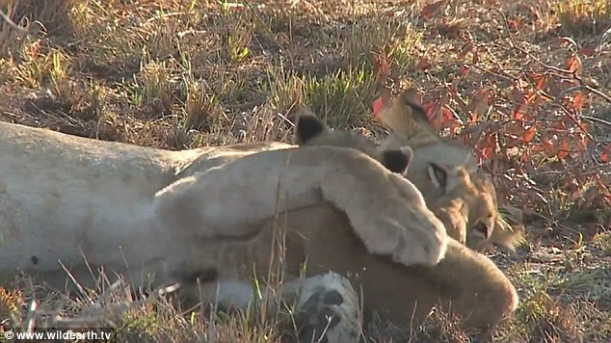 Deși dormea, leoaia nu a părut deloc deranjată de gestul puiului, motiv pentru care și-a întins membrele ei lungi în jurul micuțului.
