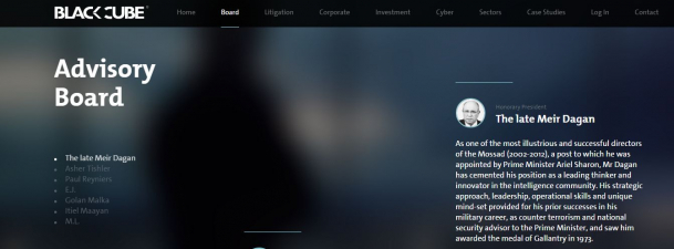 Meir Dagan, fost director Mossad în perioada 2002-2011, a fost preşedinte de onoare al Black Cube până în urmă cu trei săptămâni, când a murit din cauza unui cancer la ficat, arată washingtonpost.com. Potrivit RiseProject, patru israelieni sunt anchetați de DIICOT pentru spionarea comunicațiilor, dar și pentru tentative de compromitere a șefei DNA, Laura Codruța Kovesi, iar doi dintre aceștia sunt foști directori de informații, dar și cofondatori și directori executivi ale aceleiași companie israeliene de investigații private, Black Cube, firmă la cârma căreia s-a aflat Meir Dagan.