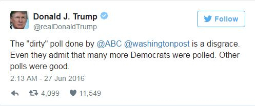 Trump a reacționat pe Twitter, acesta denunțând sondajul ca fiind necinstit.