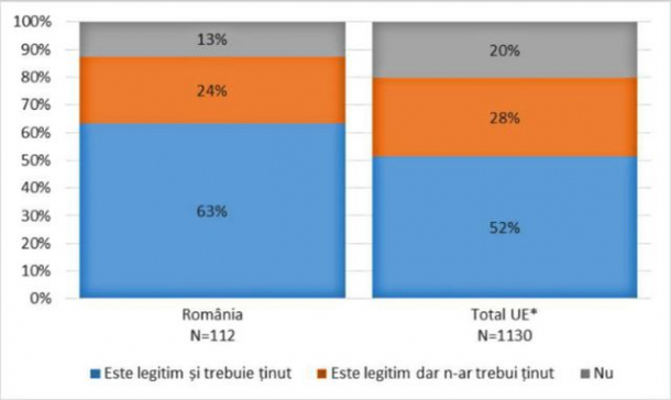 Potrivit cercetării, la prima întrebare, 63% dintre românii sunt de părere că referendumul este legitim și trebuia ținut. Ceilalți rezidenți UEau aceeași parere, procentul lor cumulat fiind de 52%, notează activenews.ro