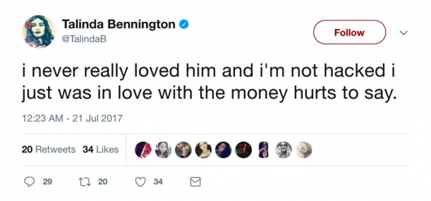 De asemenea, într-o altă postare scria că Talinda l-ar fi înșelat pe artist cu un alt membru al formației Linkin Park, Mike Shinoda. Mai mult, ea nu l-ar fi iubit pe acesta, ci era doar interesată de banii lui.
