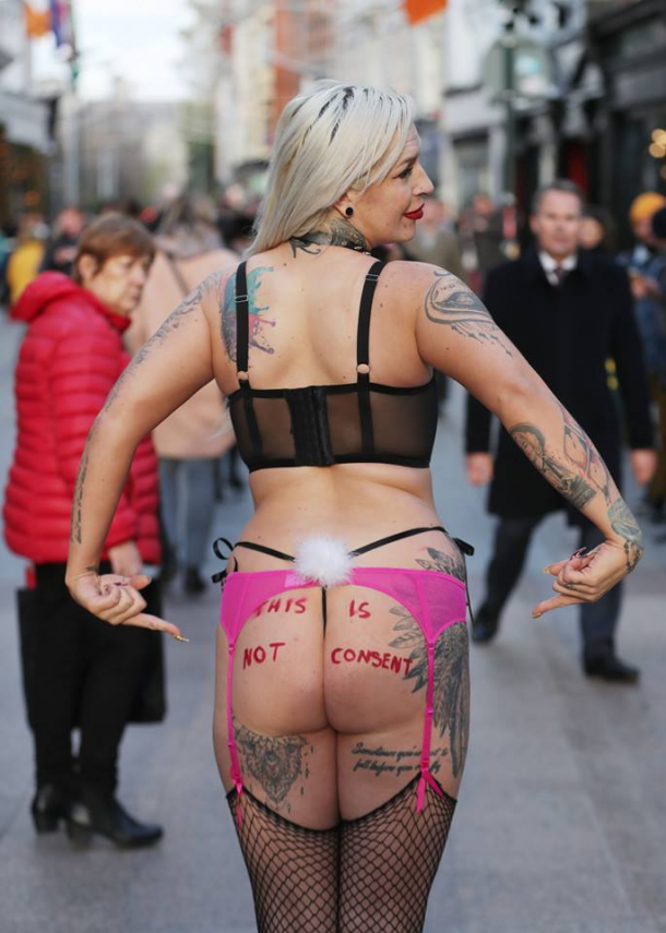 O militantă care şi-a început plimbarea zilnică prin Dublin îmbrăcată doar cu lenjeria intimă pentru a cere reforma sistemului juridic în ceea ce priveşte incriminarea violului a promis să nu se oprească până când nu i se vor alătura încă 50 de persoane, pentru a putea forța schimbarea legii.