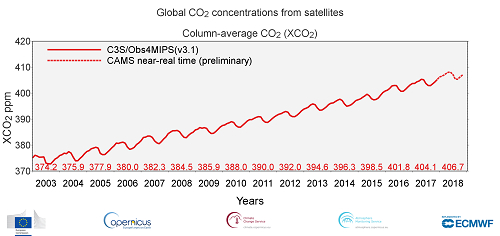 Foto: Evoluţia concentraţiilor de dioxid de carbon (sursă foto: Copernicus)