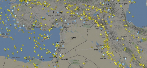 După cum se poate vedea pe flightradar24.com, site ce monitorizează traficul aerian din toată lumea, pe harta Siriei nu există niciun avion.