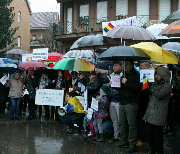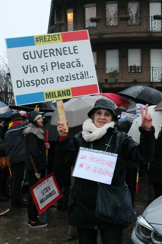 Aceștia au cântat imnul României în fața Consulatului Român din Milanoși auafișat pancarte cu mesaje precum "Altă întrebare. Când gândiți, va doare?", "Ați legalizat hoția", "Nu furtului!", "Nu ne puneți pe drumuri. Noi venim și suntem 3 milioane. Tuturor nu e dor de România!", "Ați legalizat hoția", "La închisoare, nu la guvernare".