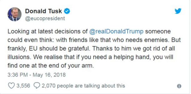 ”Privind la ultimele decizii ale președintelui Donald Trump cineva s-ar putea gândi: cu așa prieteni cine mai are nevoie de dușmani. Sincer, ar trebui să-i mulțumim președintelui american. Datorită lui nu mai avem niciun fel de iluzii. UE trebuie să rămână unită în ceea ce privește acordul cu Iranul. Trebuie să-l menținem”, a scris Tusk pe twitter.