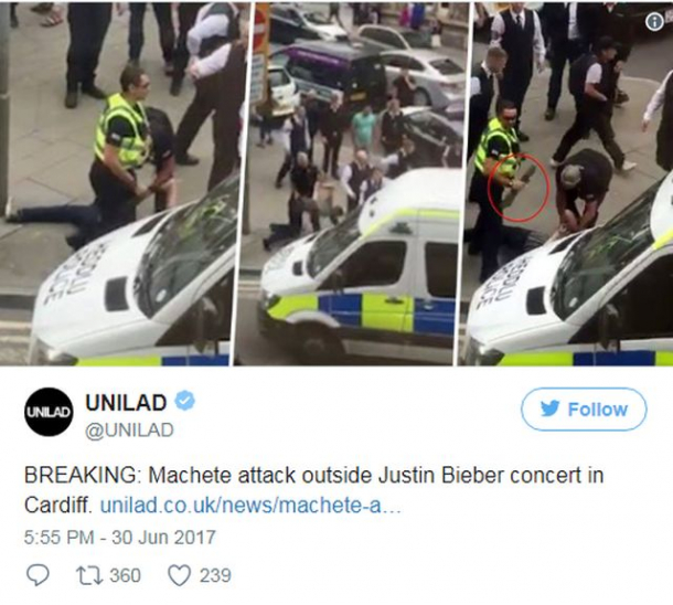 Doi bărbați suspecți au fost arestați vineri după amiază, dintre care unul avea asupra lui o macetă. Aceștia se aflau la doar 500 de metri de intrarea principală care permitea accesul către Pricipaity Stadium din Cardiff, unde se desfășura un concert al lui Justin Bieber, potrivit Unilad.